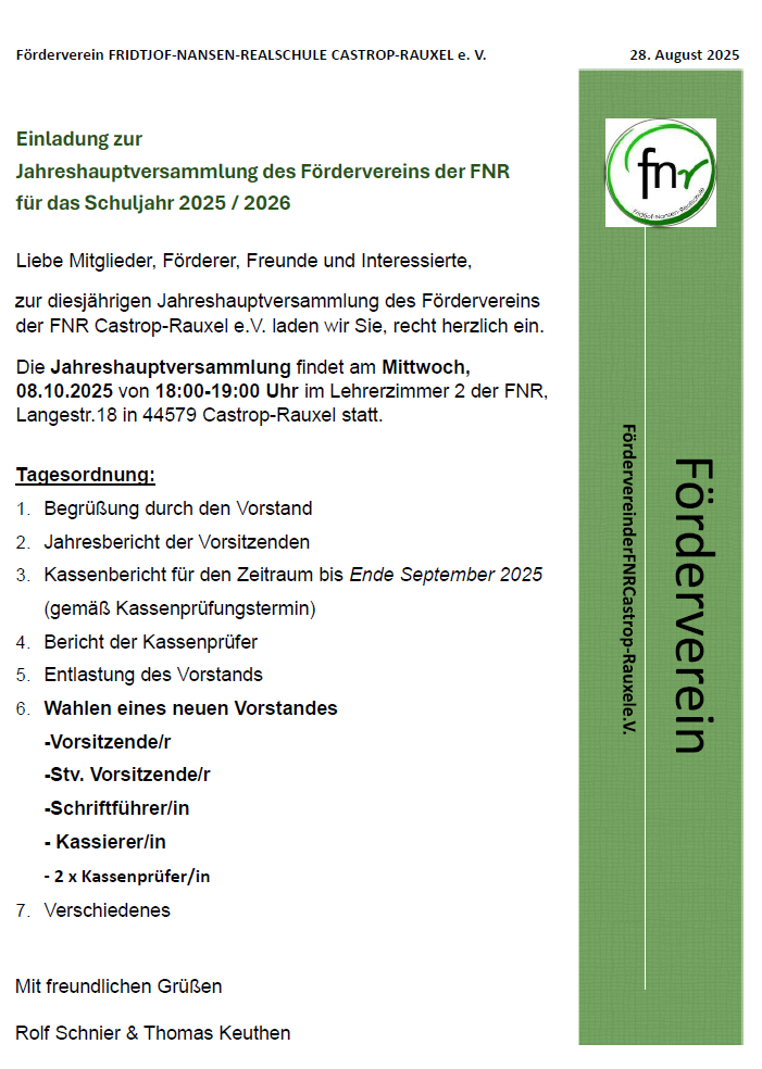 Am 08.10.2025 um 18:00 Uhr findet die Jahreshauptversammlung des Fördervereins der FNR statt. Eingeladen sind alle Mitglieder, Förderer sowie interessierte Eltern.