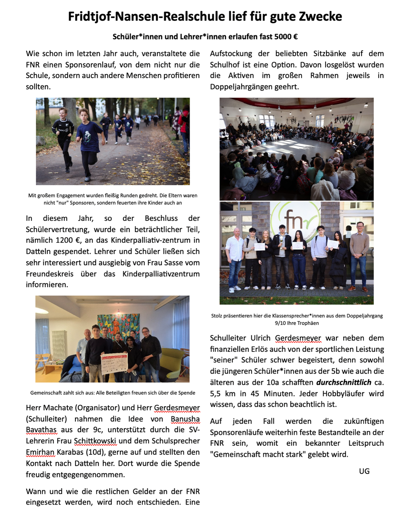 Wie in den letzten Jahren, wird es auch 2025 einen Sponsorenlauf geben. Dieser findet am 10.10.25 statt, um dann nahtlos in die Herbstferien übergehen zu können. Details zu der Organisation werden Ihnen rechtzeitig über die Klassenleitung mitgeteilt werden. Ich hoffe sehr auf Ihre (großzügigen) Spenden, denn die Gelder kommen wie in jedem Jahr einem wohltätigen Zweck und der FNR zugute. In diesem Jahr hat die SV sich dazu entschieden einen Teil dem Kinderpalliativzentrum zu spenden, um dort den lebensbedrohlich erkrankten Kindern ihr Leid etwas zu lindern. Ein großer Teil der "erlaufenen" Gelder bleiben in der FNR, um z. B. Geräte für den Pausensport anzuschaffen oder die recht neuen, sehr beliebten Sitzgelegenheiten auf dem Schulhof zu erweitern. Diese wurden auch schon durch vorherigen Sponsorenläufe finanziert. Fest steht jedenfalls, dass gutes Wetter bestellt wurde – hoffentlich wird die Bestellung auch bearbeitet